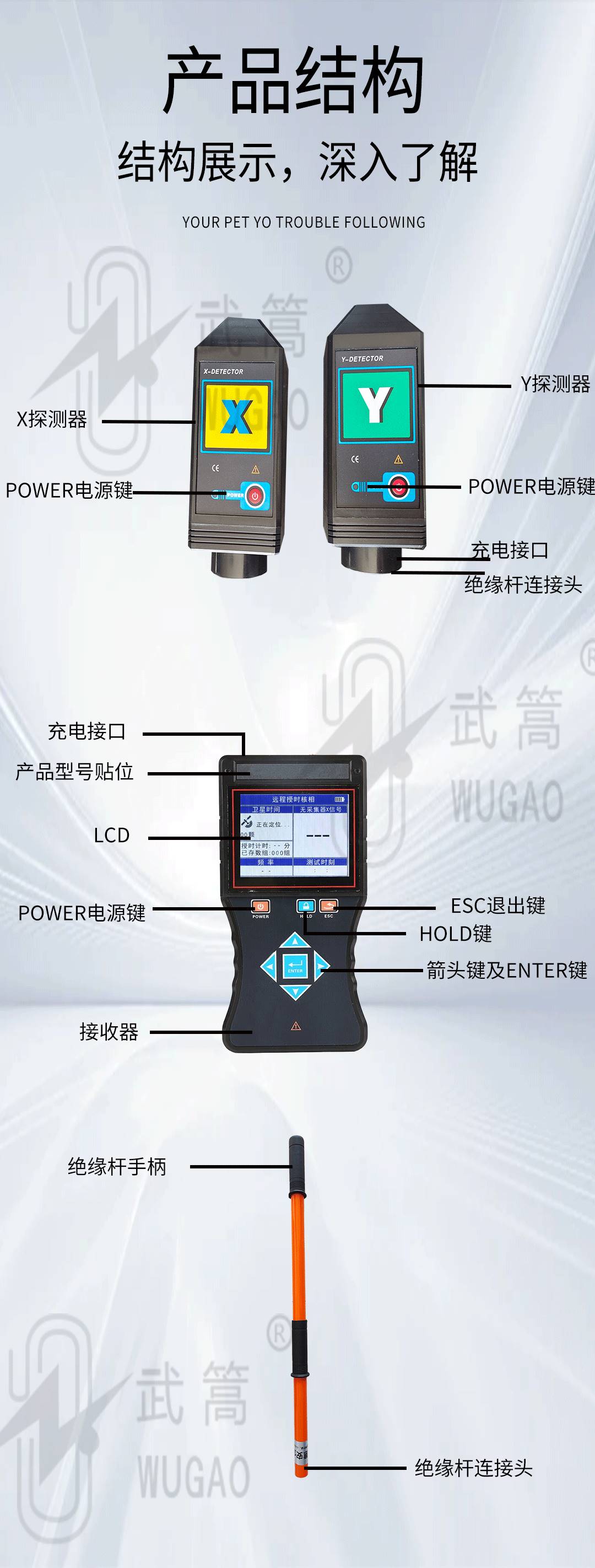 由無線接收器、探測器、伸縮絕緣桿等組成。