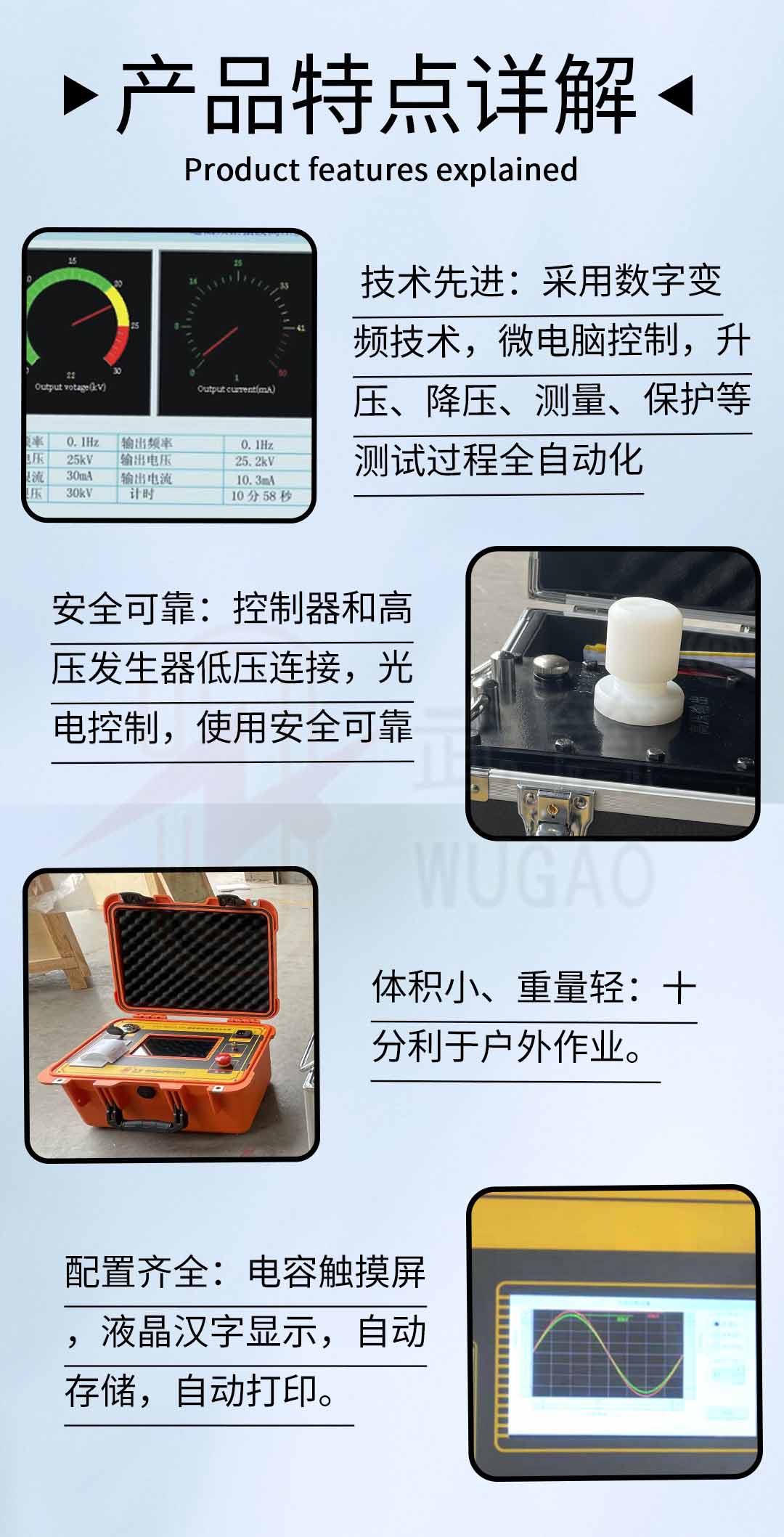 30/1.1 | 30kV (峰值) | 0.1Hz,≤1.1μF | 10A | 控制器:4㎏ 升壓器:20㎏ |